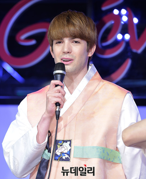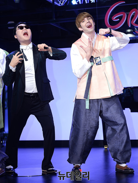 프랑스 출신 방송인 '로빈 데이아나(Robin Deiana)'가 8일 오전 서울 중구 그레뱅 뮤지엄에서 열린 '월드 셀러브리티 투어'에서 싸이 밀랍인형과 포즈를 취하고 있다.