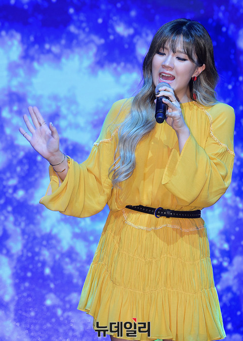엠넷(Mnet) 오디션 프로그램 프로듀스 101(PRODUCE 101)출신 김주나가 12일 오전 서울 마포구 신한카드 판스퀘어에서 열린 첫 싱글앨범 '썸머 드림(Summer Dream)'쇼케이스에서 타이틀곡 '썸머 드림(Summer Dream)'을 열창하고 있다.