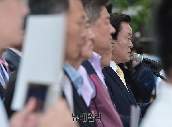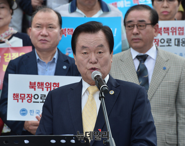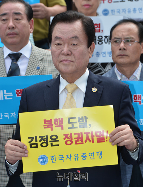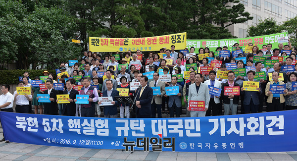 한국자유총연맹 김경재 중앙회장이 12일 오전 서울 광화문 파이낸스센터 앞 광장에서 '북한5차 핵실험 규탄 기자회견'을 열고 "북한 김정은의 5차 핵실험은 한반도의 평화와 안정을 파괴하고, 7,500만 민족의 생명까지 위협하는 극히 무모한 시대착오적 폭거이며 정권의 자멸을 스스로 선택한 것”이라고 주장했다.