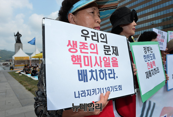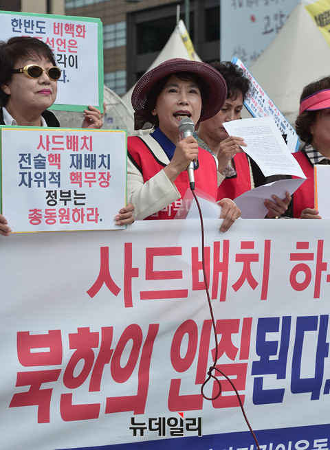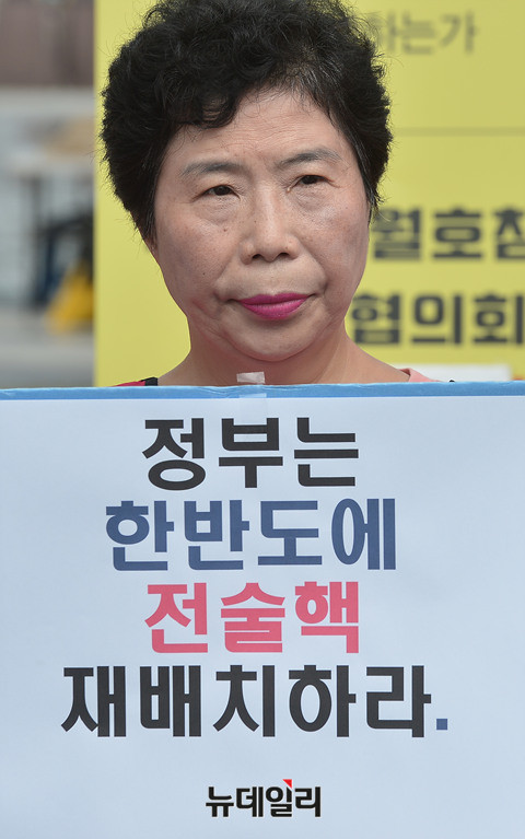 엄마부대봉사단이 12일 오전 광화문광장에서 '북한 5차 핵실험'을 규탄하는 기자회견을 열고, "정부는 핵도입을 추진하라"고 주장했다.