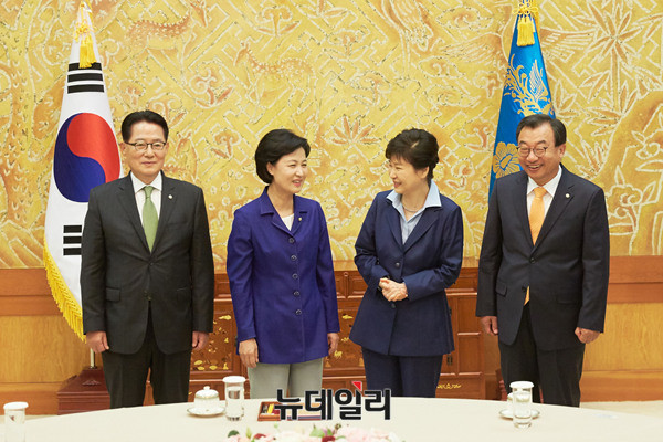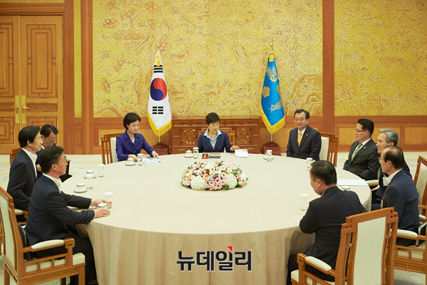 박근혜 대통령이 12일 오후 청와대에서 진행된 여야 3당 대표(국민의당 박지원 비대위원장, 더불어민주당 추미애 대표, 새누리당 이정현 대표)회동에 참석해 담소를 나누고 있다. (사진=청와대)
