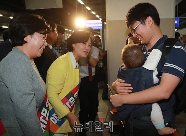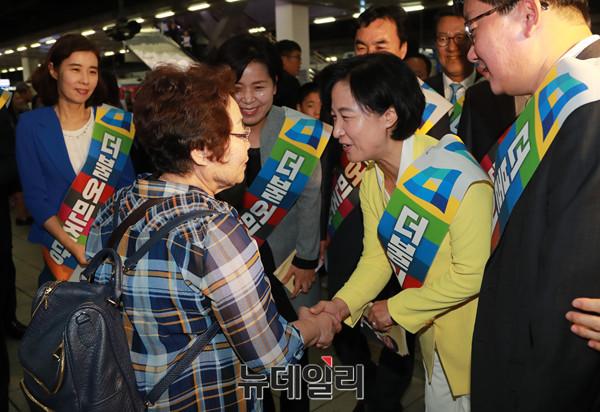 • 더불어민주당 추미애 대표와 지도부가 추석을 앞둔 13일 오전 서울 용산역을 찾아 귀성객들에게 인사하고 있다.