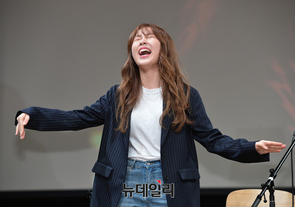 권진아가 19일 오전 서울 강남구 일지아트홀에서 첫 정규 앨범 '웃긴 밤' 쇼케이스에서 연습실에서 연습한 웨이브를 선보이고 있다.