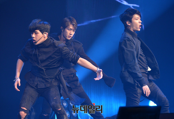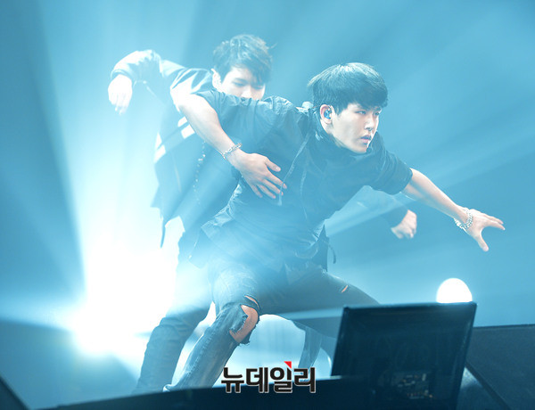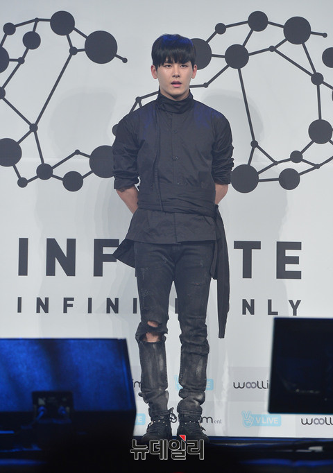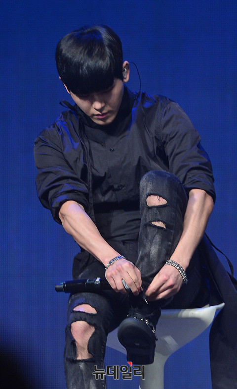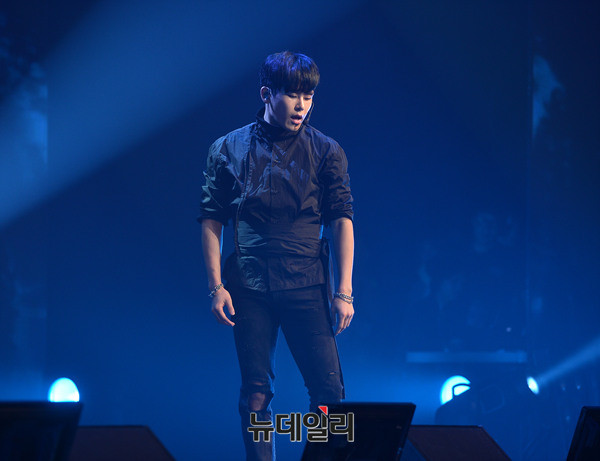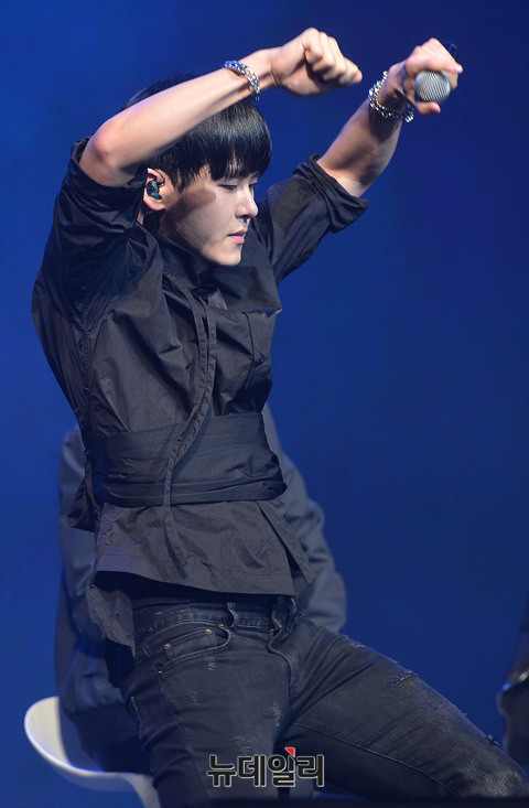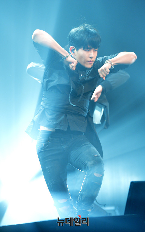 아이돌그룹 인피니트(INFINITE:김성규, 장동우, 남우현, 호야, 이성열, 엘, 이성중) 호야가 19일 오후 서울 용산구 블루스퀘어에서 열린 6번째 미니앨범 '인피니트 온니(INFINITE ONLY)' 쇼케이스에서 포인트 댄스를 선보이고 있다.