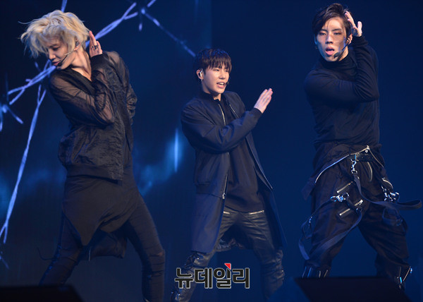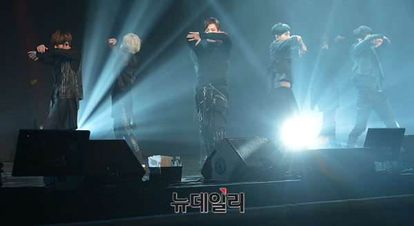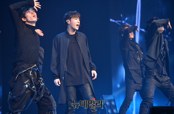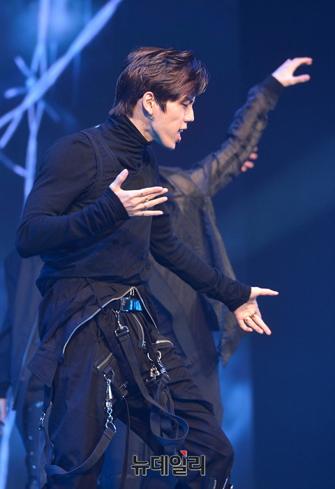 아이돌그룹 인피니트(INFINITE:김성규, 장동우, 남우현, 호야, 이성열, 엘, 이성중) 장동우가 19일 오후 서울 용산구 블루스퀘어에서 열린 6번째 미니앨범 '인피니트 온니(INFINITE ONLY)' 쇼케이스에서 '태풍' 무대를 선보이고 있다.