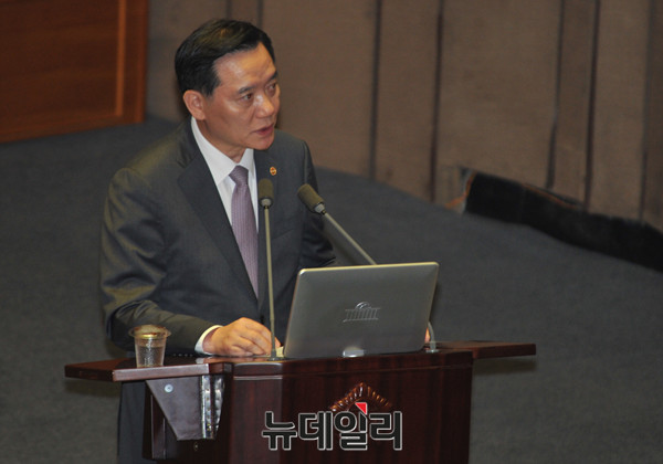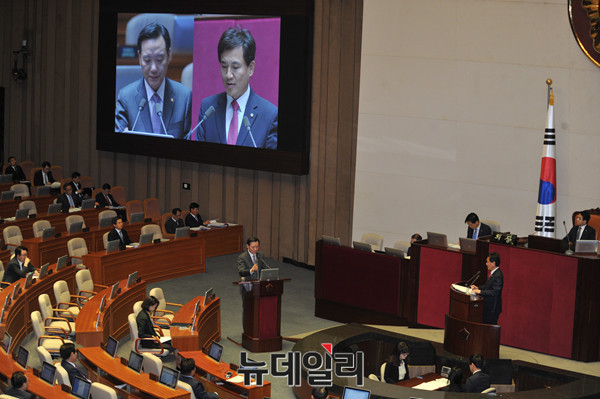 새누리당 김진태 의원이 20일 오전 국회에서 열린 정치분야 대정부 질문에서 김현웅 법무부 장관에게 대우조선해양에 고액의 유럽여행 접대를 받은 의혹을 받고 있는 조선일조 송희영 전 주필 수사를 촉구하고 있다.