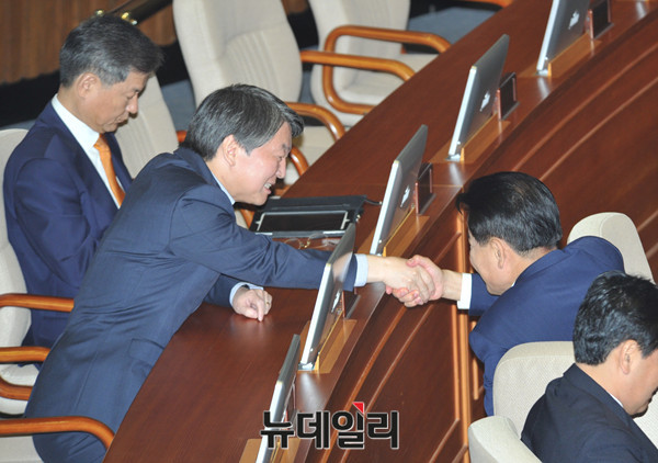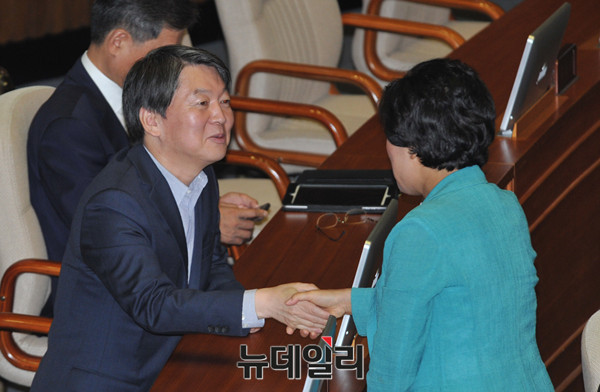 국민의당 안철수 전 공동대표가 20일 오전 국회에서 열린 정치분야 대정부 질문에서 동료 의원들과 인사를 나누고 있다.