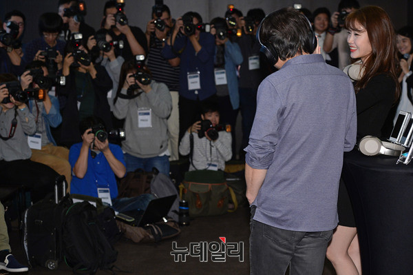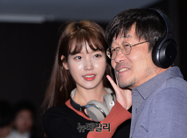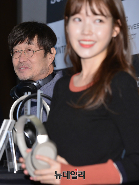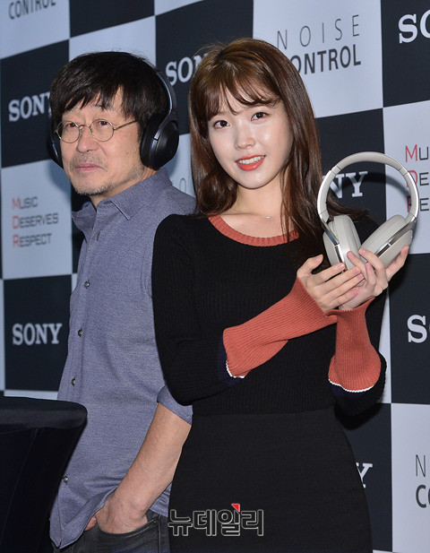 소니오디오 모델 가수 김창완과 아이유가 21일 오전 서울 중구 더플라자호텔에서 진행된 신제품 헤드폰 MDR-1000X 출시 기념행사에 참석해 '노이즈 캔슬링'을 시연하고 있다. 이날 김창완은 소니오디오 새모델로 처음 공개됐다.