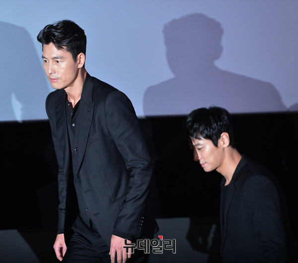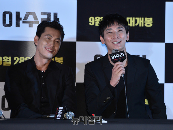 배우 정우성과 주지훈이 21일 오후 서울 성동구 왕십리CGV에서 열린 영화 '아수라(ASURA: The City of MAdness)' 언론시사회에서 참석해 질문을 듣고 있다.
