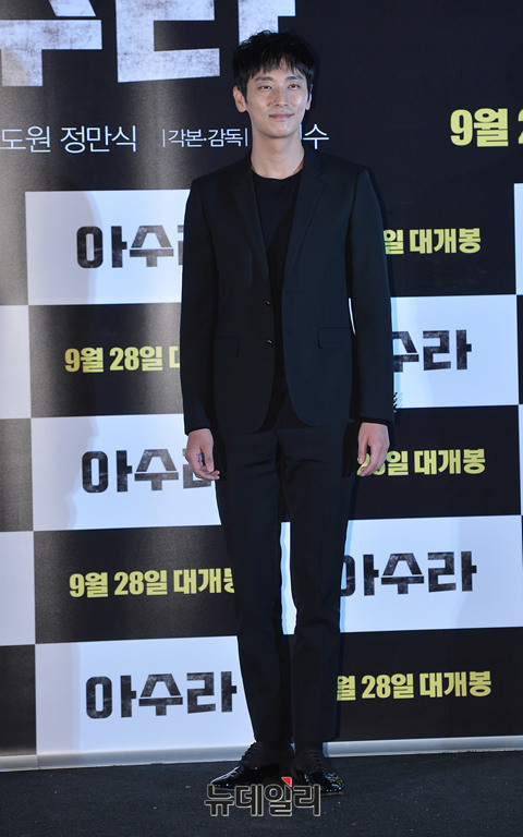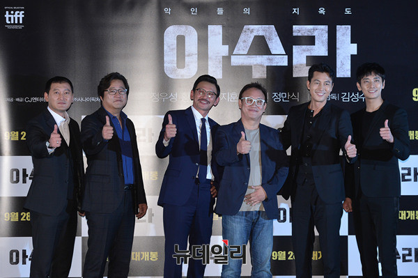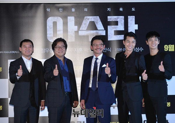 영화 '아수라(ASURA: The City of Madness)' 출연배우 정만식, 곽도원, 황정민, 정우성, 주지훈(왼쪽부터)이 21일 오후 서울 성동구 왕십리CGV에서 열린 영화 언론시사회에서 포토타임을 갖고 있다.