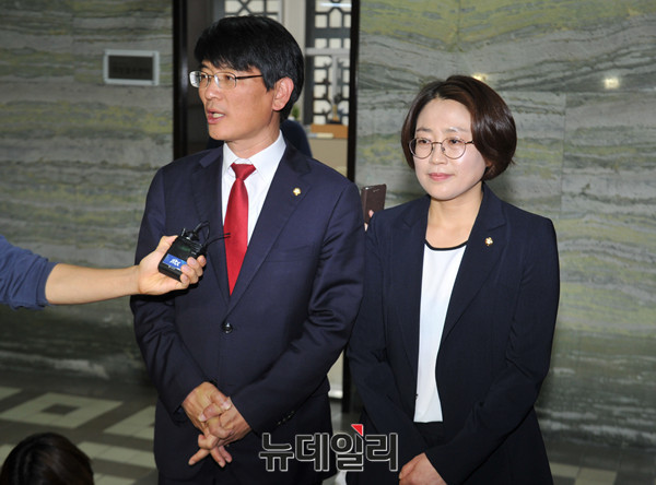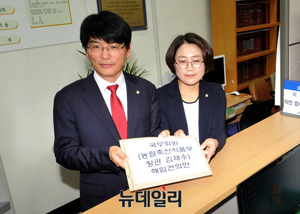 박완주 더불어민주당 원내수석부대표와 추혜선 정의당 의원이 21일 오후 국회 의안과에서 농림축산식품부 김재수 장관 해임건의안을 제출 하고 있다.