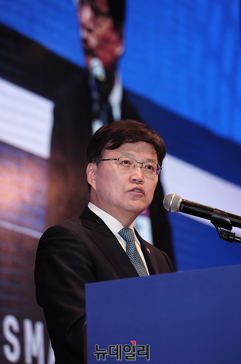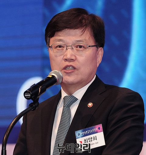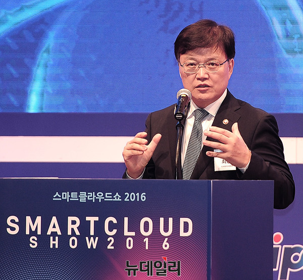 미래창조과학부 최양희 장관이 21일 오전 서울 중구 웨스틴조선 호텔에서 열린 '스마트클라우드쇼 2016' 개막식에 참석해 개회사를 하고 있다.