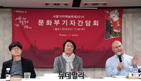 '시간의 변이' 연출을 맡은 데이비드 클락슨 스토커씨어터 대표는 "역사적인 기억을 가지고 있는 건물로 작업하고 싶었는데, 문화역서울284 공간이 가장 적합했다. 과거와 현재, 미래를 모두 담고 있다. 역사성을 가지고 새롭게 재현하는 것에 고민했다"고 말했다.이 외에도 현대 서커스 예술을 만끽할 수 있는 '소다드, 그리움(Sodade)', 베스트셀러 작품을 거리예술로 승화시킨 '눈먼 사람들(The Blind)', 다양한 오브제를 활용한 이동형 거리극 '미션 루즈벨트(Mission Roosevelt)', 현대인의 삶을 그린 폴란드 극단 KTO의 '순례자들(Peregrinus)' 등이 주목할 만한 작품들이다.폐막작 '길&Passage'는 한-불 수교 130주년을 기념해 만든 한국과 프랑스 예술단체의 공동작품으로 오는 12월 리옹 빛축제에도 초청돼 공연을 이어나간다. 이 작품은 인류 공통의 주제인 삶과 죽음에 관해 불꽃의 강렬한 이미지를 길 위에 그려낸 이동형 거리극이다.폐막일인 10월 2일에는 세종대로에서 종일 놀고 공연을 즐기는 '끝.장.대.로' 프로그램이 마련돼 있다. 이날은 행사를 위해 오전 9시부터 오후 10시까지 광화문사거리와 대한문 앞 세종대로까지 차량이 통제된다.예능PD 출신의 주철환 서울문화재단 대표는 "여의도의 벚꽃축제나 불꽃축제는 소문을 내지 않아도 굉장히 많은 사람들이 찾아온다. '서울거리예술축제'도 그렇게 되도록 노력하겠다"며 "과거 좋은 방송은 '짱'이면서 '찡'한 것이라고 말한 적이 있는데, 이는 눈이 번쩍 뜨이게 하고 가슴에 울림을 주는 거다. 문화 예술 역시 인간이 함께 살아가고 희노애락을 나누는 것"이라고 전했다.[사진=뉴데일리 공준표 기자]