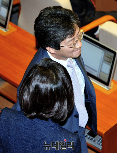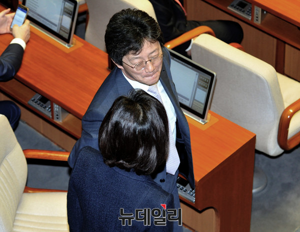 유승민 새누리당 전 원내대표가 22일 오전 국회 본회의장에서 열린 경제분야 대정부질문에서 같은 당 나경원 의원과 대화를 나누고 있다.