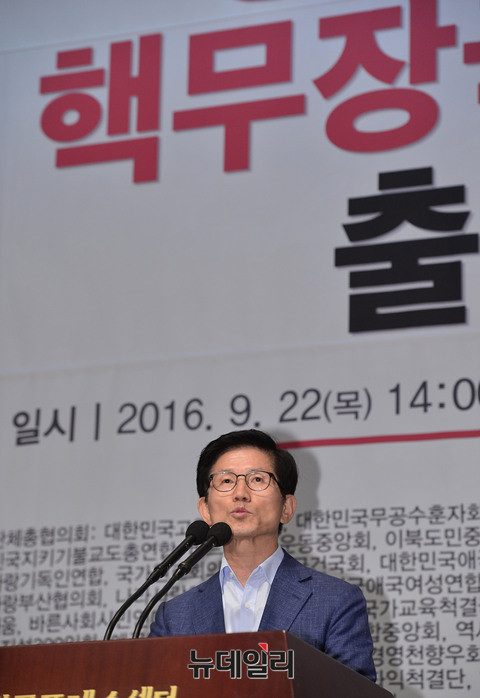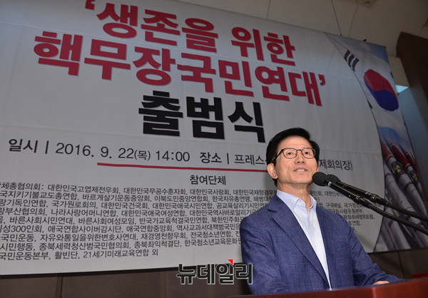 김문수 전 경기도지사가 22일 오후 한국프레스센터 국제회의장에서 열린 '생존을위한 핵무장국민연대' 출범식에서 "국회는 '북핵대책을위한상설특별위원회'를 구성해 핵무장을 포함한 모든 북핵 대응수단을 신속하게 논의해 줄 것"을 촉구했다.