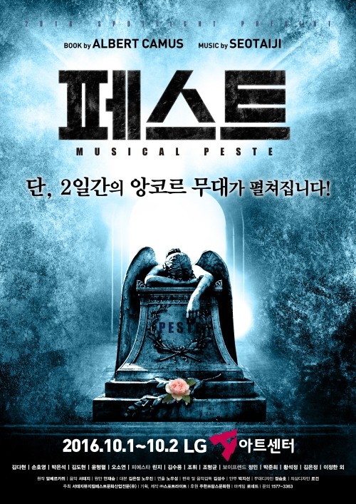 서태지 뮤지컬 '페스트'가 앙코르 공연을 확정했다.제작사 스포트라이트에 따르면 지난 7월 22일 개막한 뮤지컬 '페스트'의 초연을 9월 30일까지 성황리에 마무리하고 10월 1일, 2일 양일간 팬들을 위한 앙코르 공연을 연다.2회에 걸친 앙코르 공연에서는 당일 출연진 뿐 아니라 공연에 참여하지 않는 배우들까지 공연 직후 무대에 올라 관객들에게 작별인사를 하는 시간을 준비했다.카뮈의 동명소설을 원작인 뮤지컬 '페스트'는 서태지의 명곡들을 재해석해 뮤지컬로 탄생시킨 작품이다. 5년간의 준비과정을 거쳐 서태지의 음악이 오케스트라와 밴드 사운드로 완벽하게 재현돼 기존의 주크박스 뮤지컬과는 차원이 다른 감동을 선사했다는 평이다.또, 두 달간의 초연 동안 국내의 수준 높은 뮤지컬 팬들의 날카로운 비평을 적극 반영해 '영원', 'FM 비지니스', '틱탁'(T`ikT`ak) 등의 노래를 추가함으로써 성장하고 진화하는 공연으로 관객들의 만족도를 높이기도 했다.스포트라이트는 "국내 초연을 성황리에 마무한 '페스트'는 또 한 번 철저한 준비 과정을 통해 보다 업그레이드된 무대로 돌아올 예정이다"며 "해외에서도 당당한 우리 뮤지컬로 평가를 받을 수 있도록 발전시켜 나갈 계획이며, 향후 다양한 부가 콘텐츠를 준비하고 있다"고 밝혔다.뮤지컬 '페스트' 앙코르 공연은 멜론티켓, 인터파크, LG아트센터 홈페이지 등에서 예매할 수 있다.
