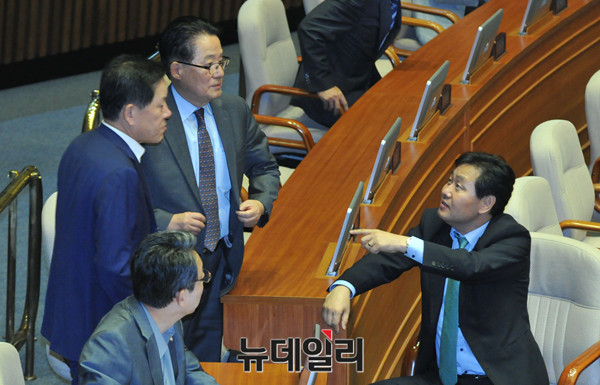 국민의당 박지원 비상대책 위원장이 23일 오후 국회에서 열린 교육 사회문화 분야 대정부질문 진행 중 새누리당 정진석 원내대표가 국무위원들의 식사 시간을 요구하며 발언대를 점거하고 있는 상황을 바라보고 있다.