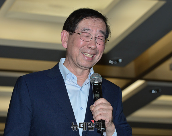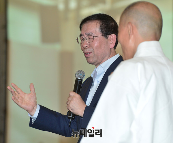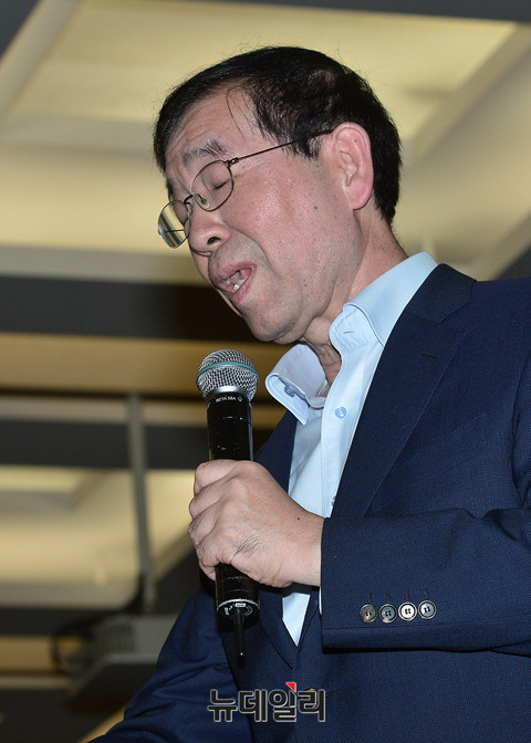 박원순 서울시장이 24일 오후 서울 백범김구기념관에서 열린 '카페트 200만명 돌파기념 친구모임'에서 도올 김용옥의 권유로 노래를 부르고 있다.