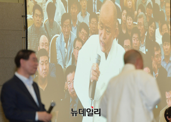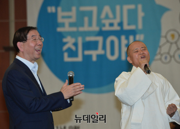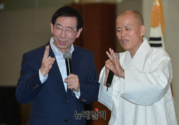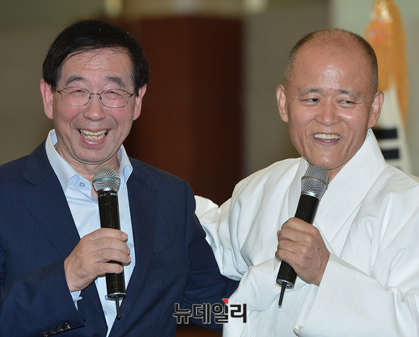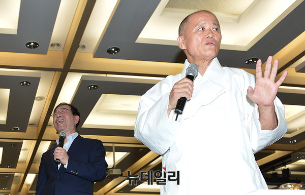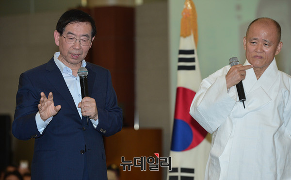 박원순 서울시장과 도올 김용옥이 24일 오후 서울 백범김구기념관에서 열린 '카페트 200만명 돌파기념 친구모임'에서 참석해 저서 '국가를말하다'에 관해 발언하고 있다.
