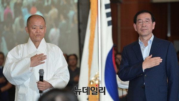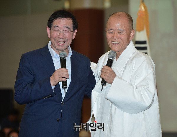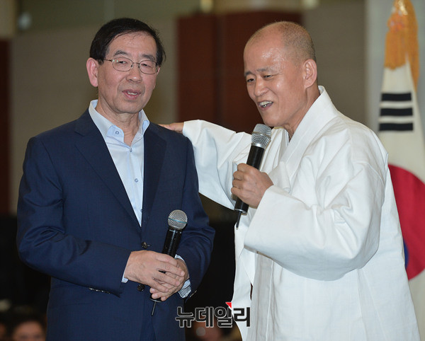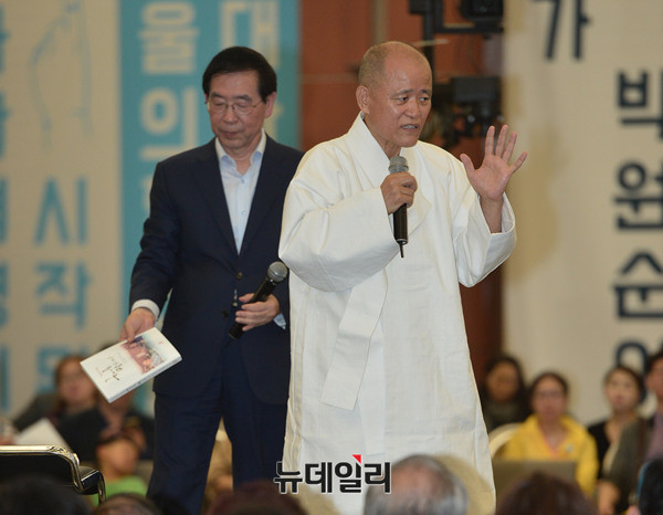 박원순 서울시장과 도올 김용옥이 24일 오후 서울 백범김구기념관에서 열린 '카페트 200만명 돌파기념 친구모임'에서 참석해 저서 '국가를말하다'와 관련한 북토크를 하고 있다.