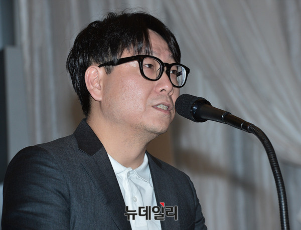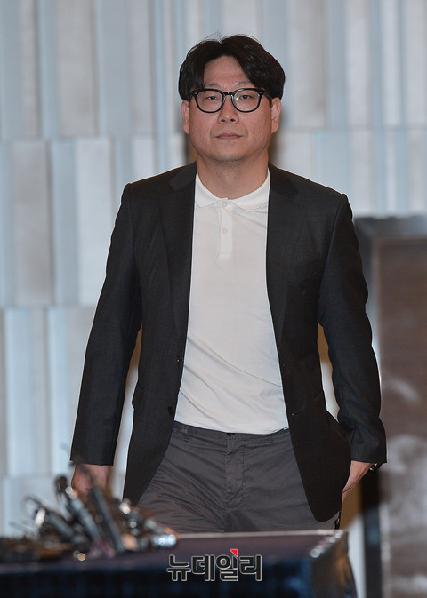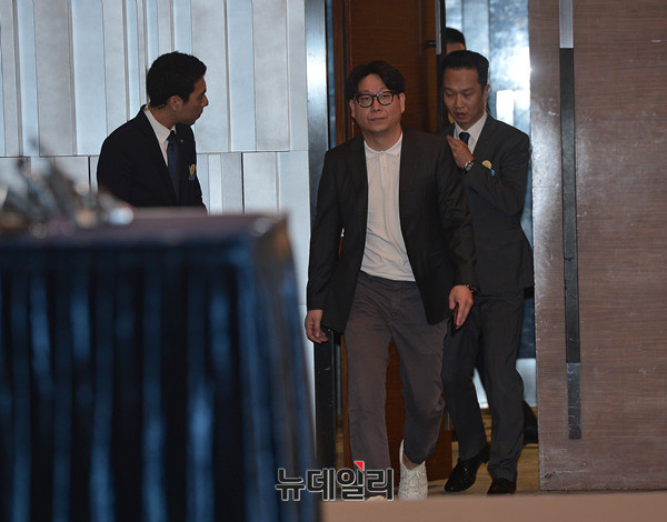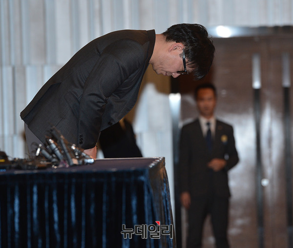 정준영 소속사 김대수 대표가 25일 서울 노보텔 앰배서더 강남에서 열린 정준영 긴급 기자회견에 앞서 고개를 숙이고 있다.