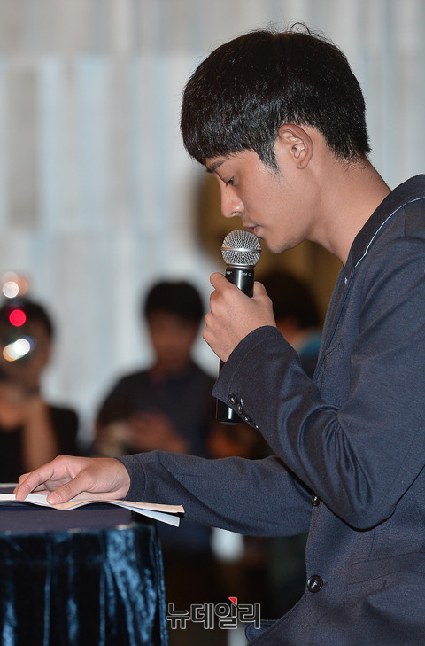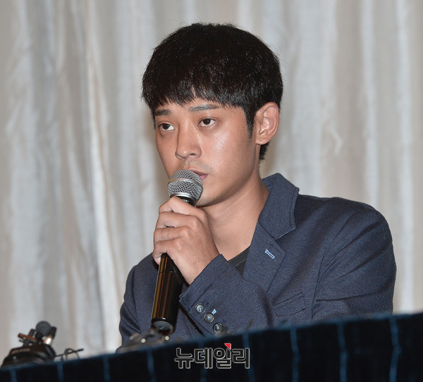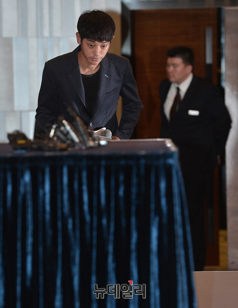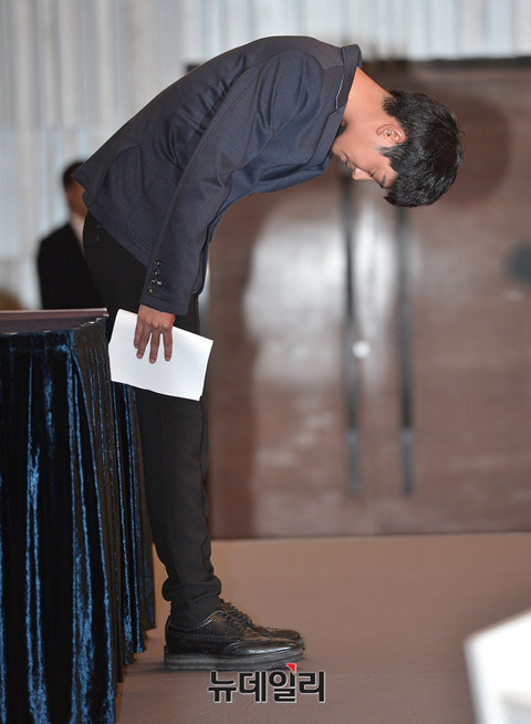 성범죄에 연루된 가수 정준영이 25일 서울 노보텔 앰배서더 강남에서 긴급 기자회견을 열고, 지난 23일 오후 불거진 성범죄와 관련된 입장을 밝히며 고개를 숙이고 있다. 정준영은 이날 기자회견에서 준비해온 기자회견문을 읽고, 질의응답 없이 곧 바로 퇴장했다.