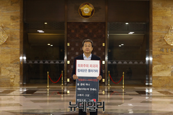김무성 새누리당 전 대표가 26일 국회 로텐더홀에서 "세월호나 어버이연합 둘 중에 하나 내놓으라는데 안내놔" 등 중립성을 잃은 발언을 항의하며 정세균 국회의장의 사퇴를 요구하고 있다.