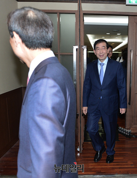 박원순 서울시장이 27일 오전 한국프레스센터에서 열린 관훈클럽 초청 토론회에 입장하고 있다.