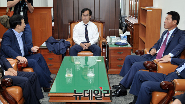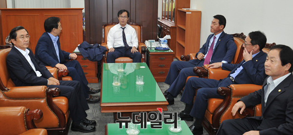 27일 오후 새누리당의 '국감 보이콧' 당론에 맞서 국감 출석의사를 밝힌 김영우(새누리당) 국회 국방위원장이 여당 의원들과 국방위원장실에서 의견을 나누고 있다.