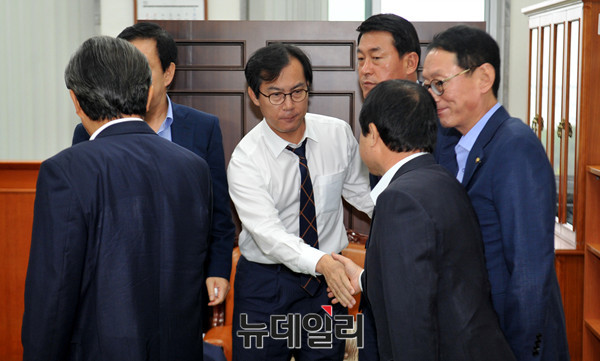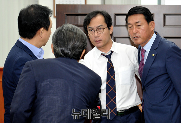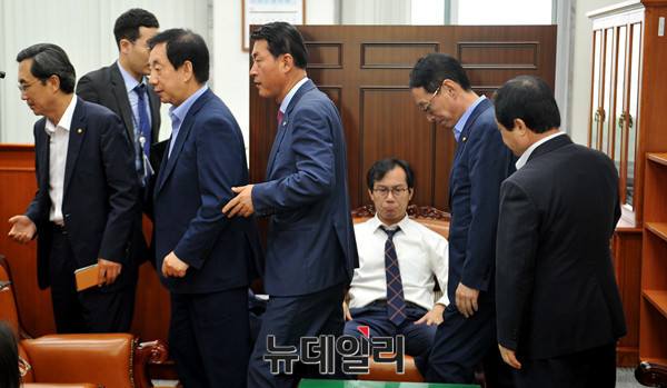 새누리당 경대수, 김성태, 황영철, 김도읍 등 의원들이 27일 오후 새누리당의 '국감 보이콧' 당론에 맞서 국감 출석의사를 밝힌 김영우(새누리당) 국회 국방위원장의 출석을 막고 설득 후 위원장 실을 떠나고 있다.