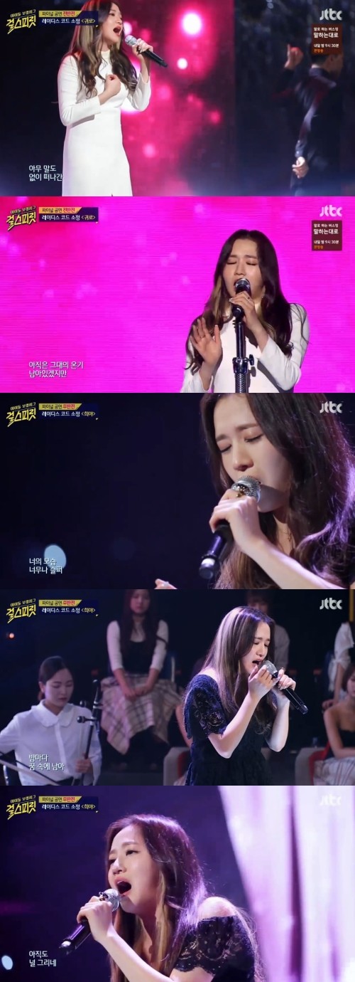 걸그룹 레이디스코드 소정이 '음색깡패'의 위엄을 드러냈다.소정은 지난 27일 방송된 JTBC 아이돌 보컬 리그 '걸스피릿' 파이널 무대에 마지막 와일드 카드로 선정돼 소름 끼치는 무대로 유종의 미를 거뒀다.이날 TOP 4를 제외한 남은 8인 중 와일드카드로 뽑힌 소정은 더욱 절치부심해 멋진 무대로 대미를 장식했다.소정은 전반전에서는 자신의 치트키인 이별 발라드곡 '귀로'를 선곡, 발라드와 탱고 2가지 버전의 편곡으로 미친 애드리브와 함께 단번에 기선을 제압하며 "아이돌 중 최고의 음색"이라는 극찬을 받았다.후반전에서는 부활의 '희야'를 해금 연주를 가미한 국악과 접목시켜 특유의 감성과 듣는 이를 절로 집중시키는 음색으로 완벽한 무대를 완성하며 뜨거운 박수갈채 속 모든 무대를 마무리했다.소정은 '걸스피릿' 종영 후 소속사를 통해 "힘들었지만 즐겁고 행복한 경험이었다"라며 "결과나 성적보다는 제가 보여드리고 싶었던 음악을 들려드린 것에 만족한다. 앞으로 더욱 좋은 음악하는 소정이가 되겠다"고 소감을 전했다.한편, 소정이 속한 레이디스 코드는 새 앨범과 함께 완전체의 모습으로 곧 컴백할 예정이다.[사진=JTBC '걸스피릿' 11회 방송화면 캡처]