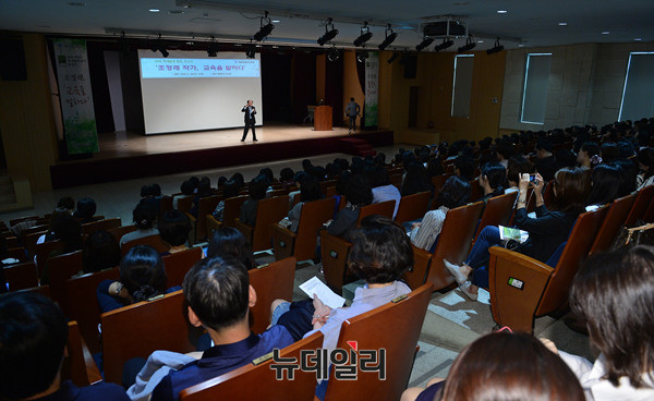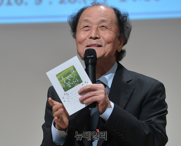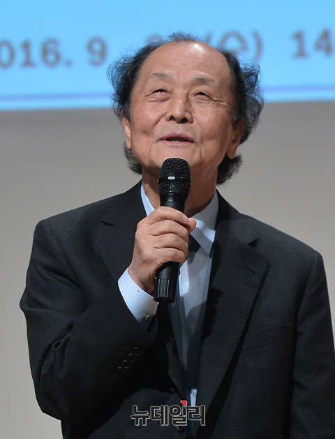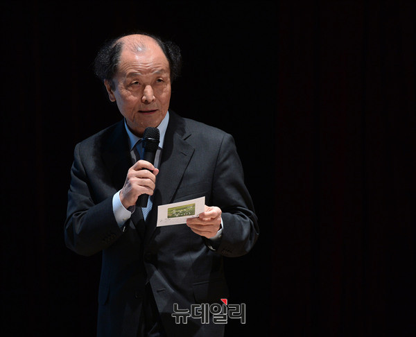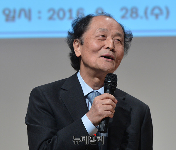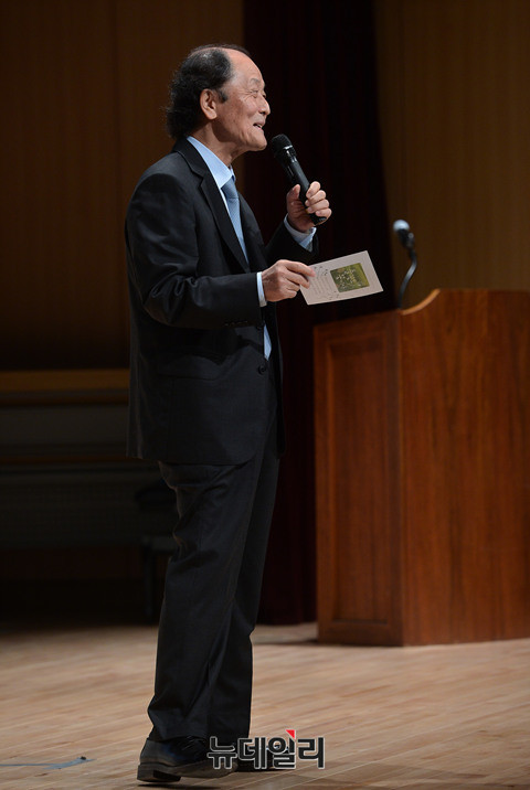 조정래 작가가 28일 오후 서울 중구 예원학교 대강당에서 열린 '조정래 작가와 함께하는 북토크'에 참석해 강연하고 있다. 이날 북토크에는 조희연 서울시교육감이 참석했다.