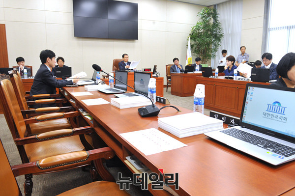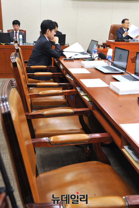 새누리당 당론인 국정감사 보이콧을 거부한 하태경 의원이 29일 오전 국회에서 열린 환경노동위원회 국정감사에 참석해 앉아 있다.
