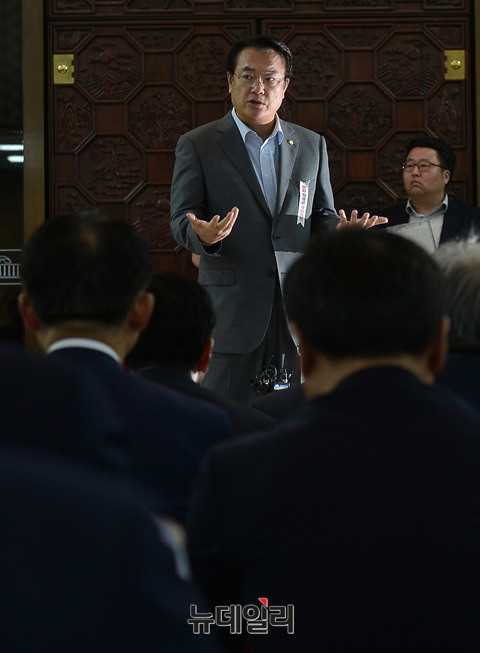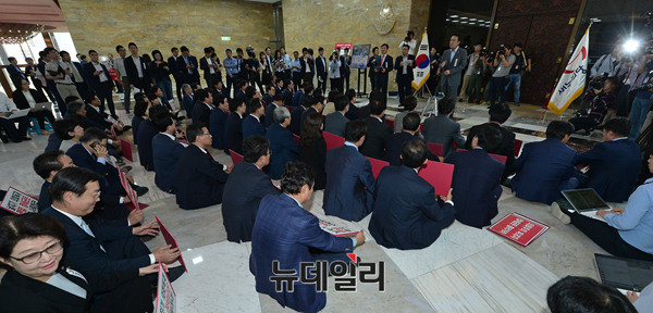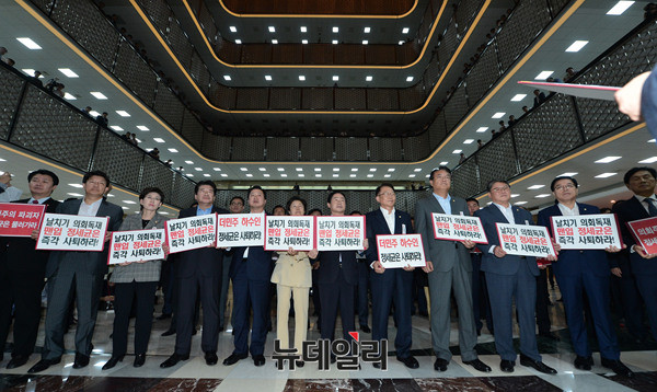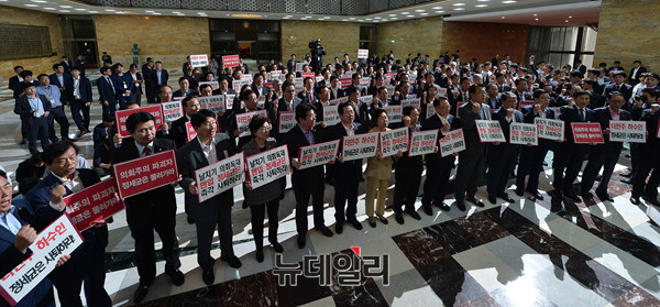새누리당 의원총회가 29일 오후 국회 로텐더홀에서 열린 가운데 정세균 국회의장 사퇴를 촉구하는 구호를 외치고 있다.