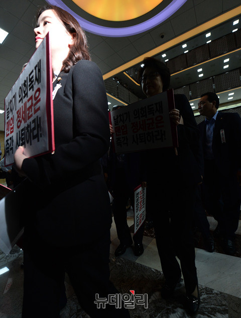 새누리당 신보라 의원이 29일 오후 국회 로텐더홀에서 열린 새누리당 의원총회 참석하기 위해 회의장으로 입장하고 있다.