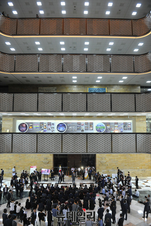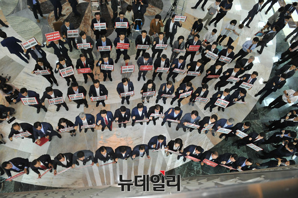 새누리당 소속 의원들이 29일 오후 국회 로텐더홀에서 의원총회를 갖고 정세균 국회의장의 사퇴를 촉구하고 있다.