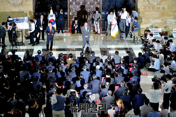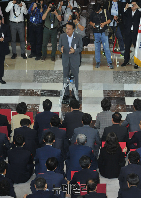 새누리당 정진석 원내대표가 29일 오후 국회 로텐더홀에서 의원총회를 갖고 정세균 의장의 사퇴를 촉구하고 있다.