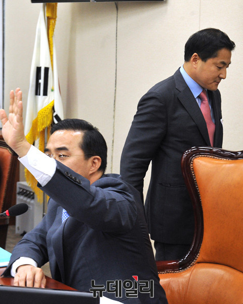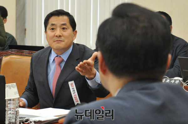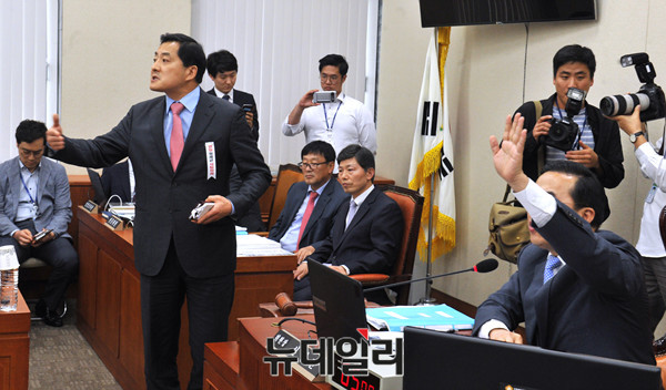 새누리당 박대출 의원이 29일 오후 미래창조과학방송통신위원회 국정감사장을 찾아 야당 간사인 박홍근 더불어민주당 의원이 사회권 발동한 것에 대해 항의하고 있다.