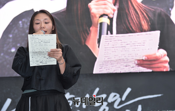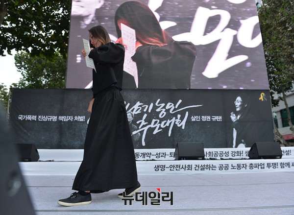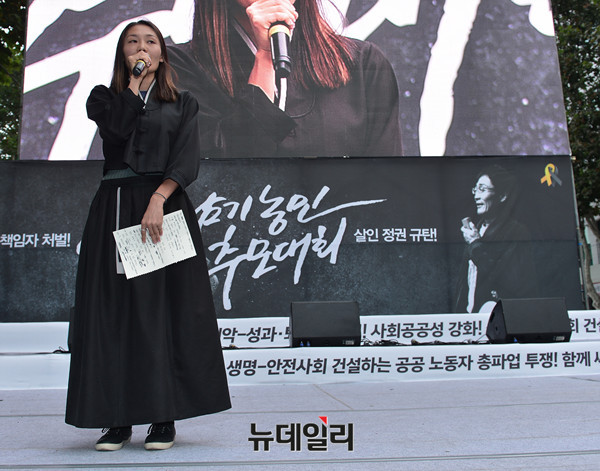 故 백남기 씨의 둘째 딸 백민주화 씨가 1일 오후 대학로에서 열린 '백남기농민 추모대회'에 나서 발언을 한 뒤 퇴장하고 있다.