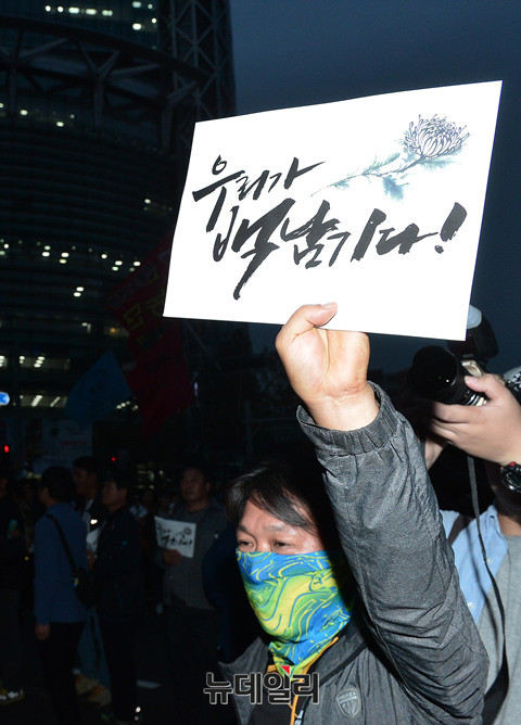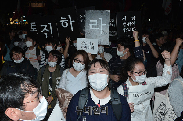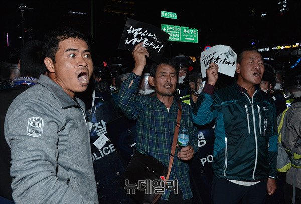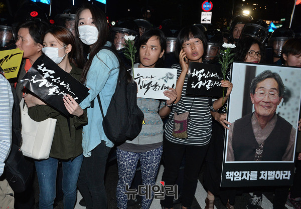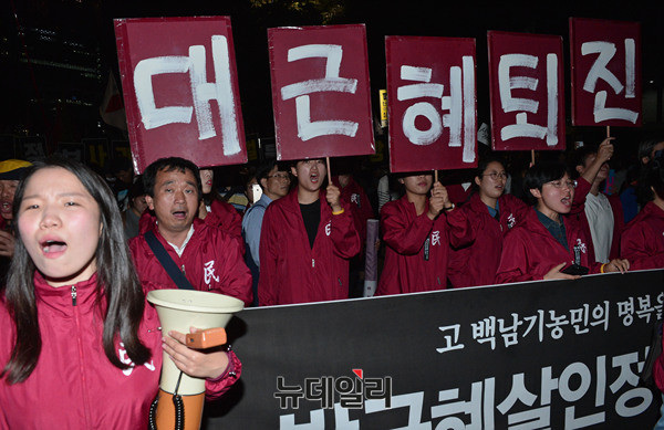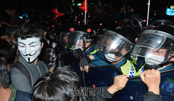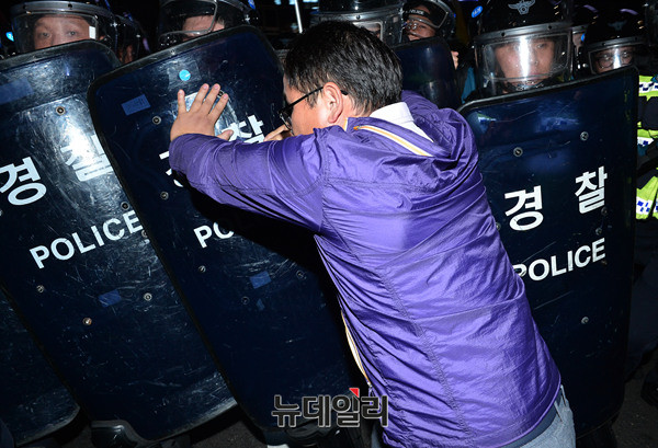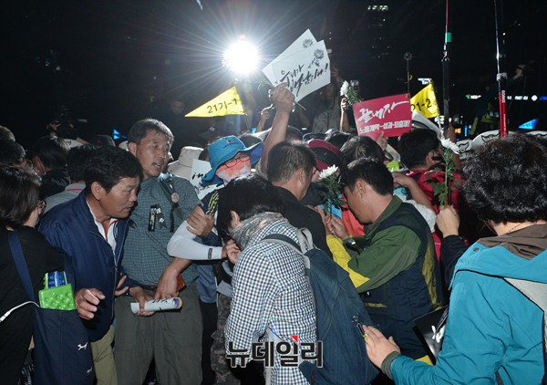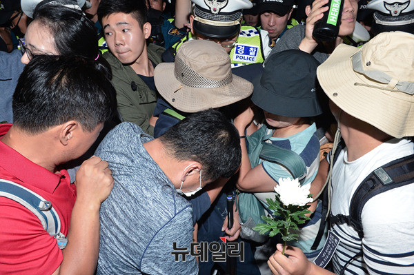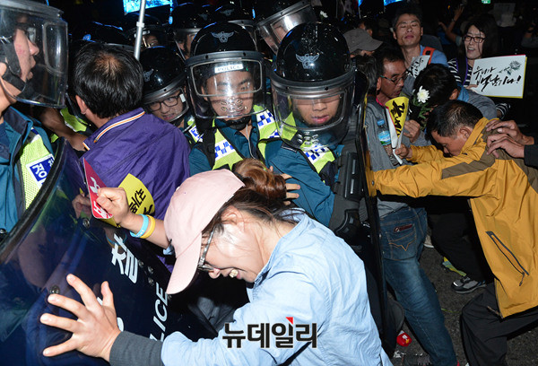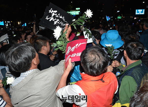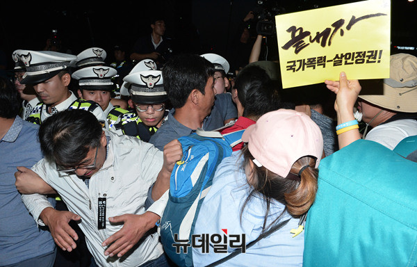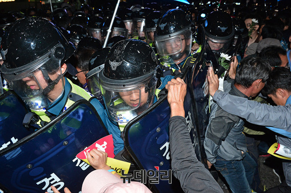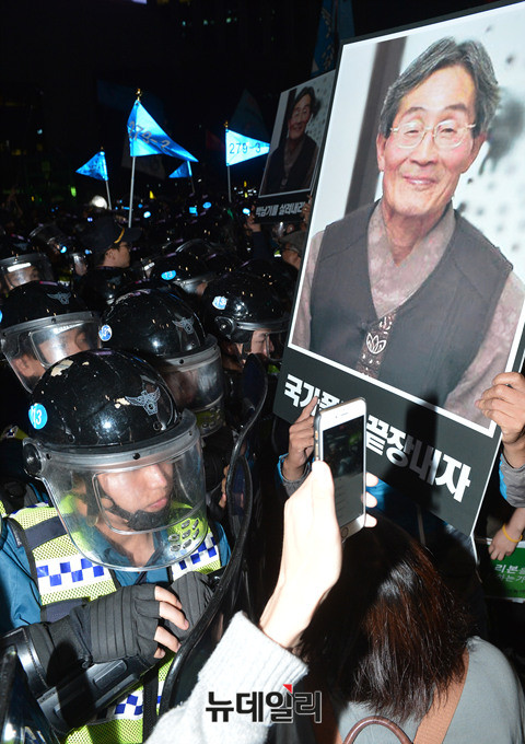 이날 가두행진은 종각에서 모전교까지 예정돼 있었지만 집회 참가자들이 국화를 헌화하겠다며 르메이에르 종로타운까지 행진을 하는 과정에서 경찰과 충돌했다. 종로구청 입구 사거리는 故 백남기 씨가 지난해 11월 민중총궐기 당시 물대포를 맞고 쓰러진 장소다.