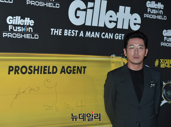 배우 하정우가 4일 오후 서울 강남구 강남스퀘어에서 열린 질레트 '프로쉴드(Proshield)' 팝업 공간인 '질레트 월드 쉴드 헤드쿼터' 오픈 기념행사에 참석해 본인의 사인 앞에서 포토타임을 갖고 있다.