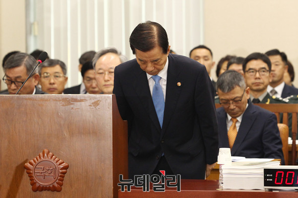 한민구 국방부 장관이 5일 오전 국회 국방위원회에서 열린 국방부 국정감사에서 선서를 하고 있다.