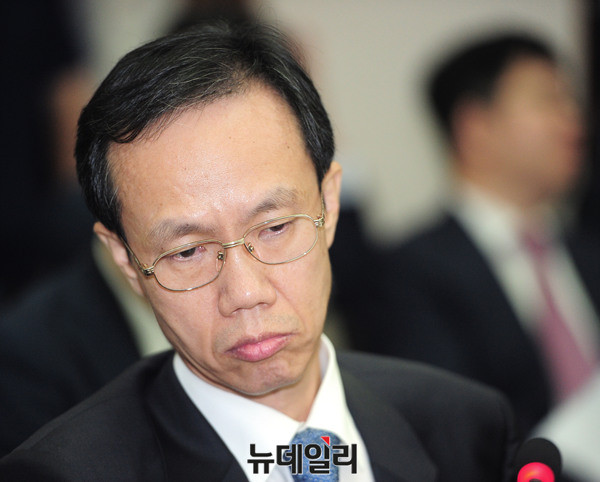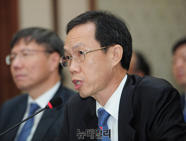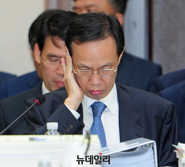 강형주 서울중앙지법원장이 5일 오전 서울고등법원에서 열린 국회 법제사법위원회 서울고등법원ㆍ서울중앙지방법원 등에 대한 국정감사에 참석해 머리를 쓸어넘기고 있다.