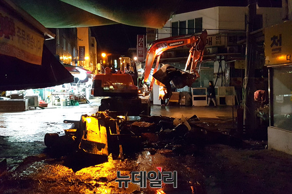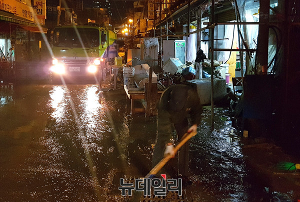 제18호 태풍 차바가 울산을 덮친 5일 오후 울산 중구 태화종합시장 상인들이 밤도 잊고 복구작업에 열중하고 있다.