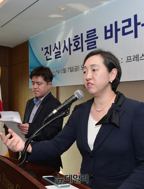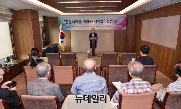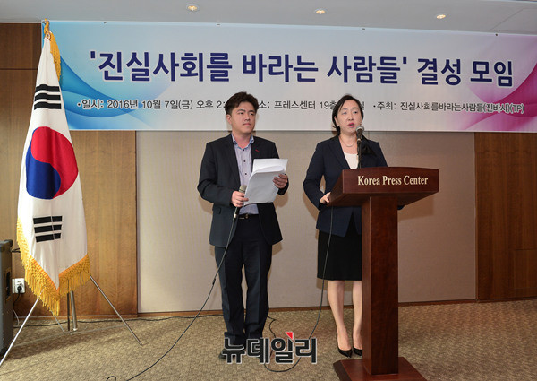 진실사회를바라는사람들(이하 진바사) 인지연, 이상헌 공동대표가 7일 오후 한국프레스센터에서 열린 진바사 출범식에서 결성취지를 밝히고 있다.