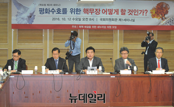 원유철 새누리당 전 원내대표가 12일 오전 국회 의원회관에서 '평화수호를 위한 핵무장 어떻게 할 것인가'라는 주제로 열린 핵포럼 제3차 세미나에서 모두발언을 하고 있다.