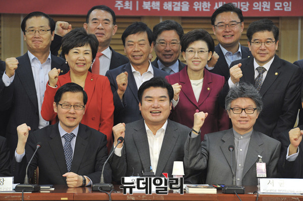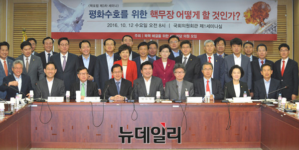 '평화수호를 위한 핵무장 어떻게 할 것인가'라는 주제로 열린 핵포럼 제3차 세미나가 12일 오전 국회 의원회관에서 열린 가운데 원유철 의원 등 참석자들이 기념사진을 찍고 있다.
