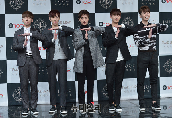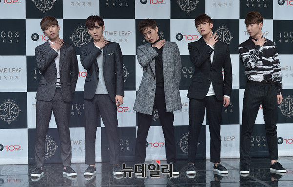 아이돌그룹 '백퍼센트(혁진, 록현, 찬용, 민우, 종환)'가 12일 오후 서울 강남구 일지아트홀에서 미니앨범 'TIME LEAP(타임 리프)' 쇼케이스를 갖고, 가요계 컴백을 알렸다. 사회는 개그맨 류근지가 맡았다.