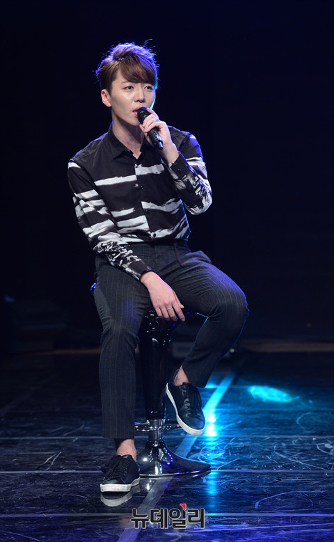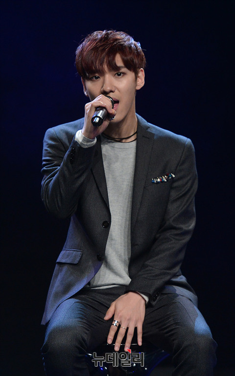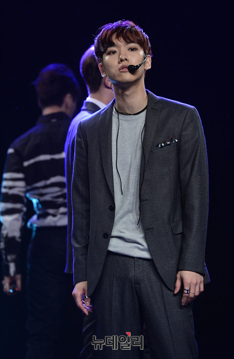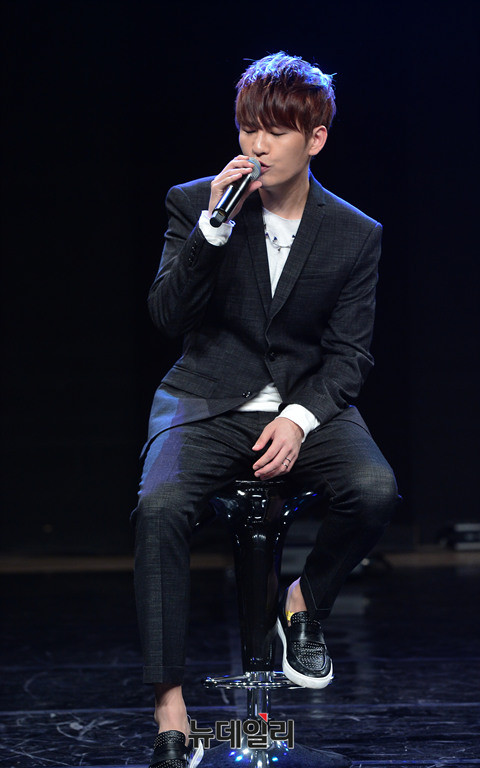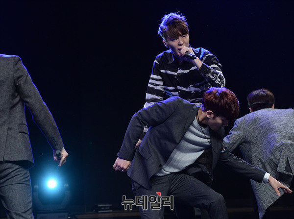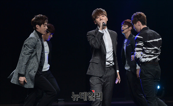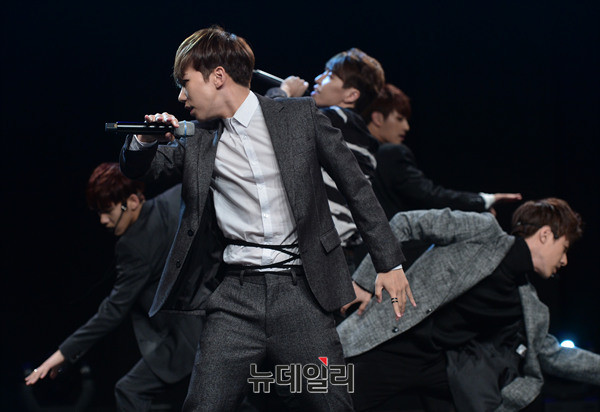 아이돌그룹 '백퍼센트(혁진, 록현, 찬용, 민우, 종환)' 가 12일 오후 서울 강남구 일지아트홀에서 미니앨범 'TIME LEAP(타임 리프)' 쇼케이스에서 신곡무대를 선보이고 있다. 이날 백퍼센트는 타이틀곡 '지독하게'와 '너라서' 2곡을 선보였다. 사회는 개그맨 류른지가 맡았다.