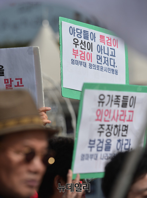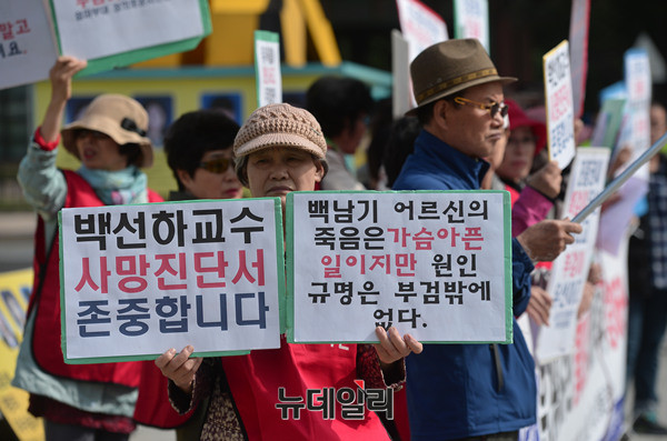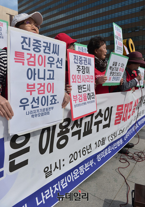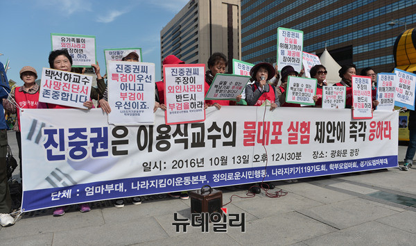 엄마부대봉사단이 13일 오전 광화문광장에서 기자회견을 열고 "故 백남기 씨의 사인을 외인사로 주장하는 진중권 교수는 물대포 실험에 직접 나서라"고 요구했다. 이어 "진중권 교수 당신이 의사인가, 한 번이라도 현장에 있었나? 의료와 거리가 먼 비전문가가 이런 망발을 할 수 있나? 진 교수는 머리숙여 백배사죄하라"고 말했다.